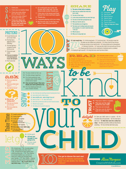 It’s not often that my professional work inspires me to be a better parent – if, in fact, it ever has. That changed while working on a recent design project. The assignment was to turn a popular blog post — “100 Ways to be Kind to Your Child” — into a poster.