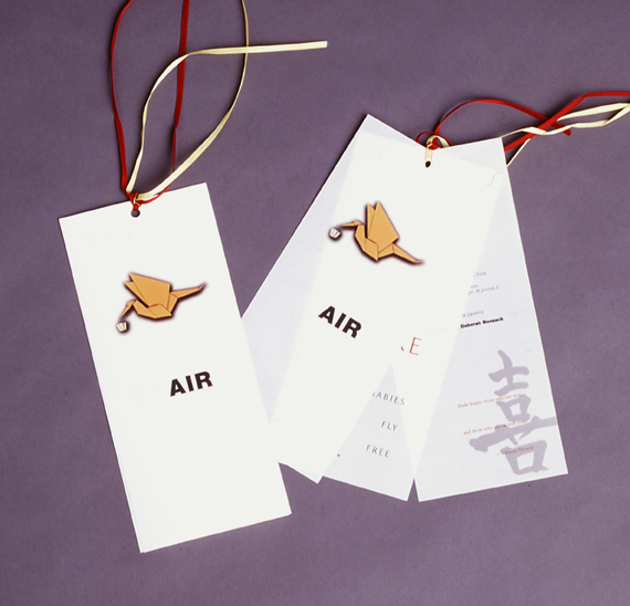 Our client was adopting a little girl from China, and wanted something clever and sweet to announce this unique family being formed. It was printed on 3 sheets of semi-transparent vellum (to give the appearance of rice paper), and featured an illustration of an origami stork delivering a tiny Chinese carry out box. It says “AIR” on the top panel, and “CLAIRE” on the 2nd panel underneath, with the “AIR” in each word overlapping. The tag line reads like the cutest airline ever: “Babies fly free.” On the bottom panel are the specifics of Claire’s birth along with the Chinese character for happiness. It was all tied together with strands of red and gold ribbon and mailed in a custom envelope.