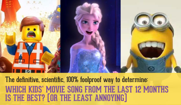 So… between “Everything Is Awesome,” “Let It Go,” and “Happy,” which one is the best? Or perhaps a better question, the least annoying? I decided to break it down scientifically to give you an objective, definitive and 100% fact-based answer. I took into account several factors, then gave points for each category to reach my accurate, foolproof, final results.