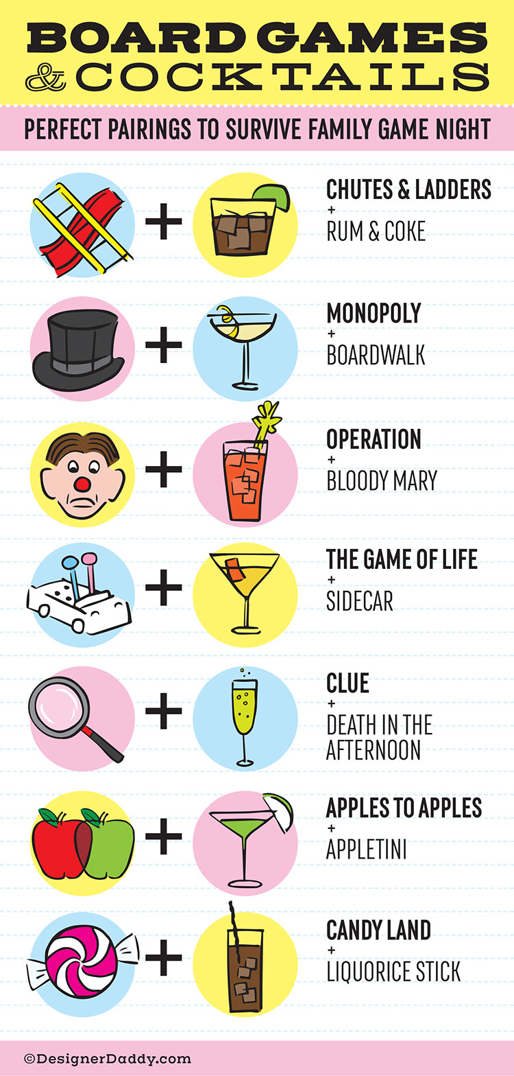 I’ve found that a little libation makes any activity run more smoothly. Classy folks look to experts for pairings of alcohol with their cheeses, meals, or cigars. You can even find wine to go with Girl Scout cookies. So why not match up cocktails with board games?