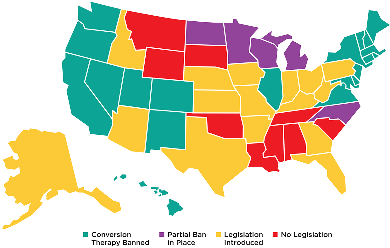 In recent years, numerous US states and foreign countries have passed legislation banning conversion therapy. Progress! More than 20 states and territories have outlawed conversion therapy from being practiced on minors, and there is active legislation in more than 20 more states and regions.