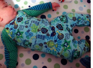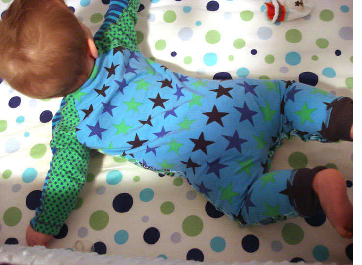 JJ is modeling the funnest, funkiest pajamas ever to cover a baby’s bottom! Luckily I had the foresight to take photos, but the jammers themselves have since been carted off to our local consignment shop. So I can’t say for certain what brand they are, but after a little poking around the interwebs, I think they might be from Sweden-based Polarn O. Pyret. There are some colors and patterns on some of their current line reminiscent of these super stylin’ PJs. And even if it’s not the exact brand, I’m excited about the new find and will be checking it out, as JJ’s about to grow out of his 12-monthers. And winter’s a comin’.