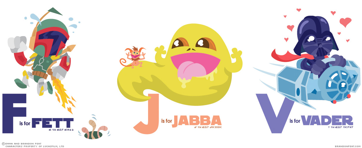 When my wife Emma (also a graphic designer) and I found out we were pregnant with our first child, we began thinking of fun ways to decorate a baby boy’s room. Since we live in an apartment and aren’t allowed to paint the walls, that meant posters or prints of some kind. And, being artists, we naturally wanted to create those prints ourselves. In the end, we decided to illustrate an alphabet of characters from one of our favorite franchises – Star Wars – dubbed “A is for Ackbar.”