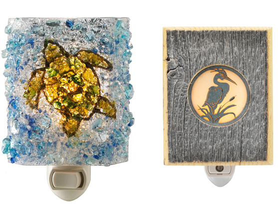 Uncommon Goods nightlights: glass turtle | wood heron