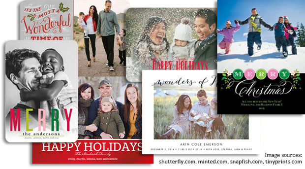 The companies I profiled were Tinyprints, Shutterfly, Minted, and Snapfish. I chose these four because they all sent me catalogs, and because they all ranked among the top photo card companies, according to Top Ten Reviews. In the two years since, I’ve received three and then two catalogs, respectively, and have indicated that in the data below. As in 2013, when reviewing each company’s online offerings, I looked at the first couple of pages of Holiday and/or Christmas cards. This generally included between 150-200 cards.
