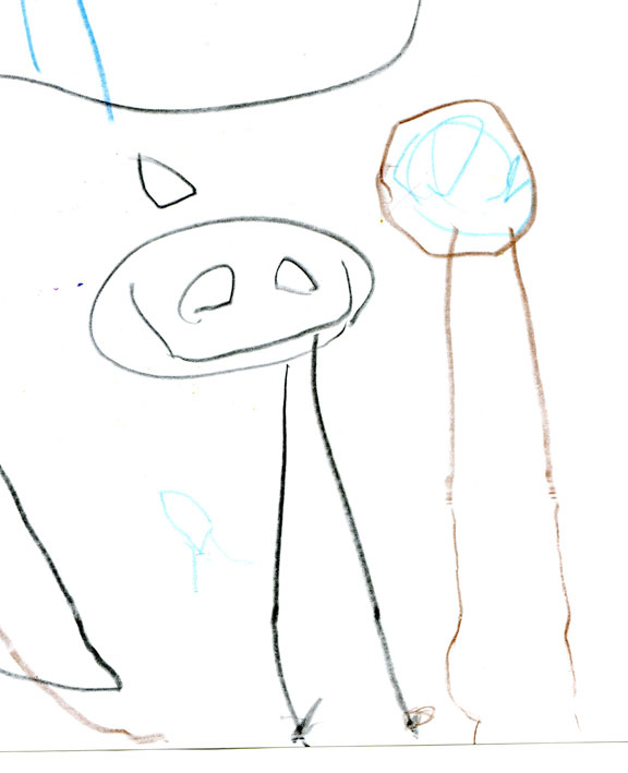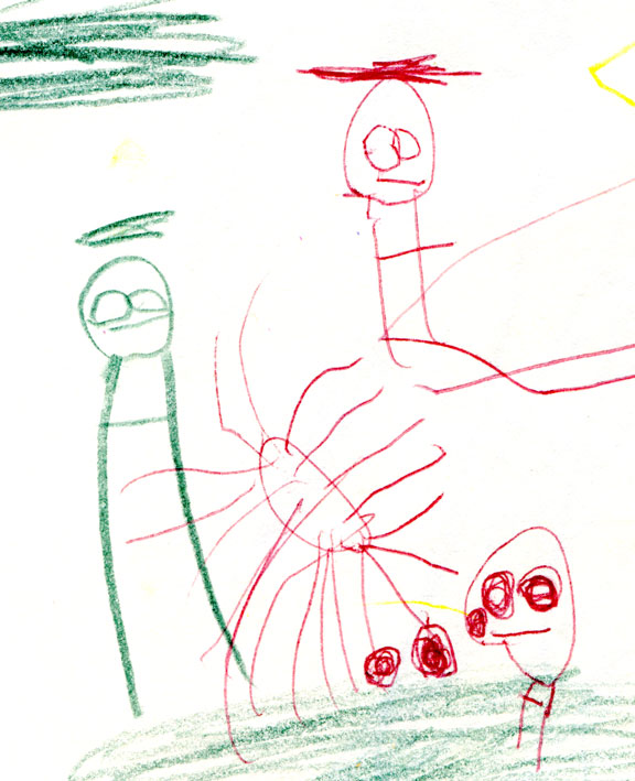 This is a drawing I did at roughly the same age. I’m sure lots of kids start out drawing people this way (what they have against arms, I don’t know) — but the similarity struck me, made me giddy in fact. Biological relatives frequently attribute shared talents or passions to genetics. But not being genetically related to my son, these connections hold extra significance for me.