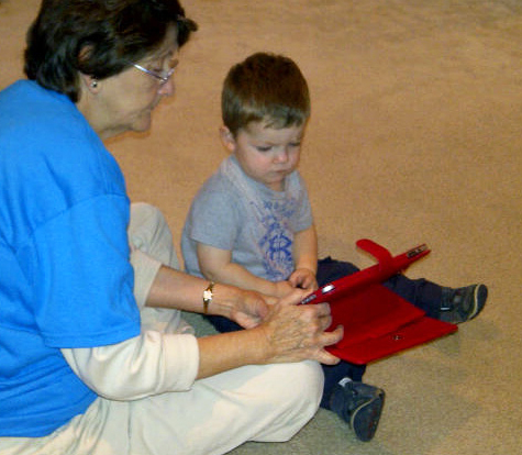 We just got around to playing it last night, and it was a HUGE hit. The only other interactive book we’d read up to this point was A Present for Milo (oddly unavailable in the iTunes store). I loved Milo‘s illustrations, but it was too slow and monotone for my rambunctious almost-two year old. However Monster has all the right elements to hold a toddler rapt: simplicity, repetition and expressive narration (Hellllooooo, everybodeee!) Plus it has cool features you can adjust based on your child’s reading level, as well as narration tips for Dad or Mom (or Gramms, see photo after the jump) to make it even more interactive and fun.