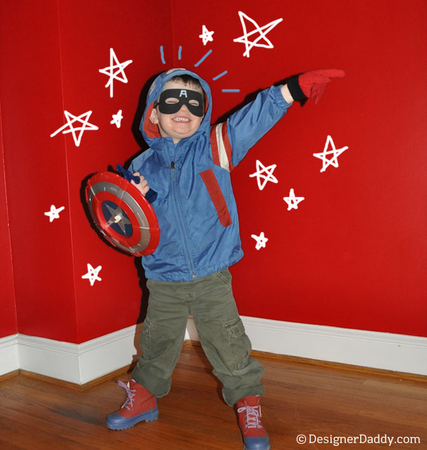 Check out this photo (slightly embellished by yours truly — hey, my name IS Designer Daddy) of my Mighty Avenger rocking the cool Captain America shield toy Nesquik sent us. It was a great way to “cap” off all the other costume items we already had, and turn Jon into Captain America, Jr.