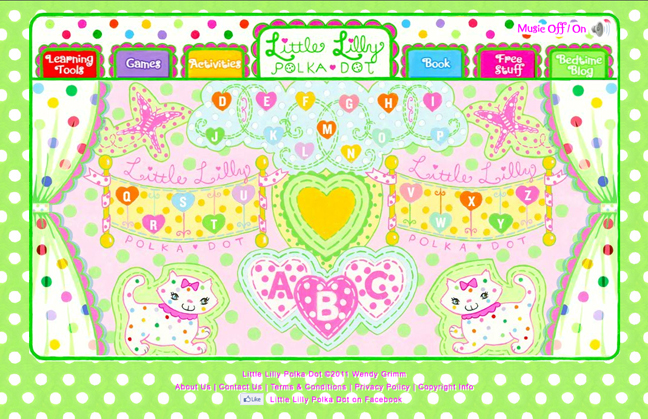 But I wanted to give a shout out to the site and its creator — author/illustrator Wendy Grimm — due to our shared love of polka dots! The site is based around her book, Little Lilly’s Polka Dot World… but it’s a whole lot more than that. The fun and well-designed site is chock full of color and (simple, not annoying) animation, and features an interactive ABCs game (which JJ loved), pages to print out and color, as well as an online version of the book — which can be viewed with or without narration. But I think my favorite part is how the curtain opens and closes between each section of the site. Random, I know, but I love me some polka dots!