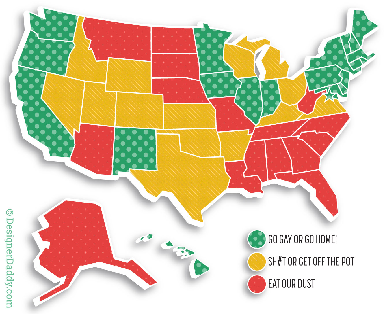 First it was legalized. Then it wasn’t. Then yesterday a judge overturned the ban. While I’m very glad for this step back in the right direction, the governor still plans on appealing the overturn of the denial of the freedom for the refusal of rights on the ban and… OH MY GOD I’M SO CONFUSED!!! So until same-sex marriage in Utah is a once-and-for-all done deal, signed in blood and toasted with Caffeine-Free Diet Coke, I’m holding off on putting their magnet up gain.