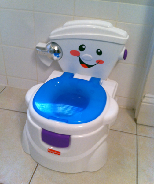 I mean seriously — faced with the daunting task of pooping on your own for the first time, which would you prefer? The bright-and-shiny, super-smiley “Cheer for Me! Potty? Or the miniature electric chair? I don’t know how anyone survived childhood before Fisher-Price…