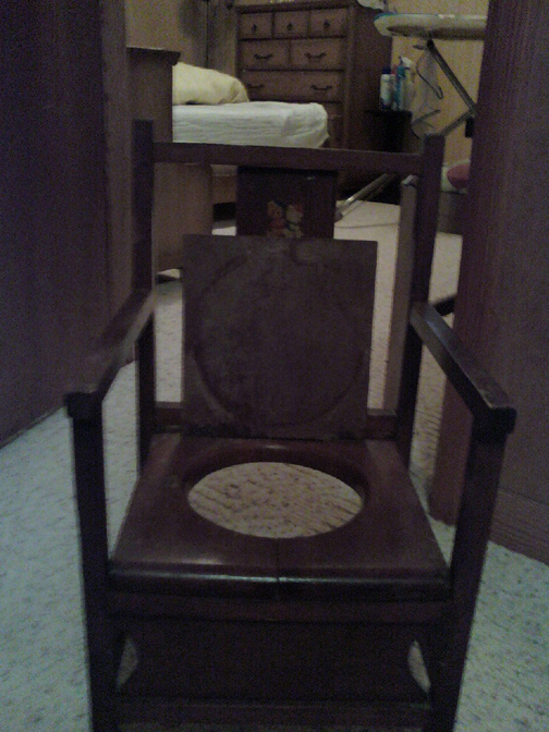 This monstrosity is my Dad’s training toilet, unearthed while my parents were going through my recently deceased Grandmother’s things. Last used during the Truman administration, it looks to be made entirely of dark wood, with a faded Dick & Jane-type illustration on the back. While I’m all about vintage furnishings, I couldn’t see us using this for anything except maybe an outdoor planter. Or perhaps if we lived in the American Horror Story house.