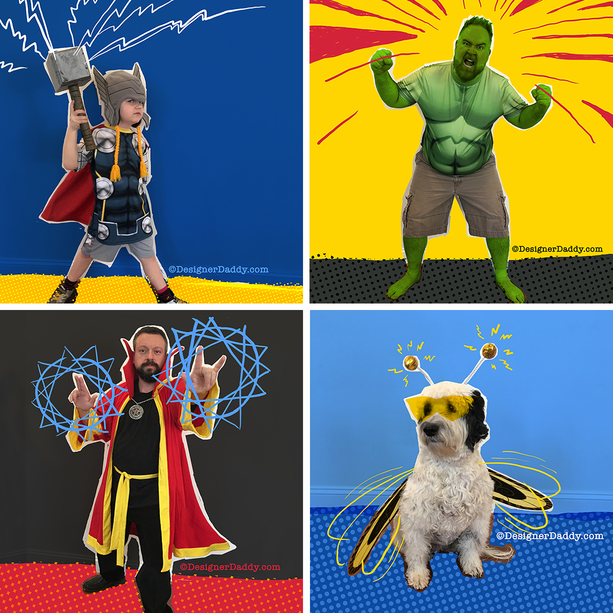 In addition to dressing up for candy, on rare occasions we got to dress up for money. One of my favorite sponsored posts saw our entire family (dog included) decked out in Marvel gear to promote their #WhoIsYourHero campaign. And yup, all four of the characters were Stan Lee creations.