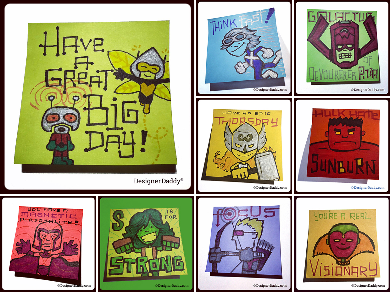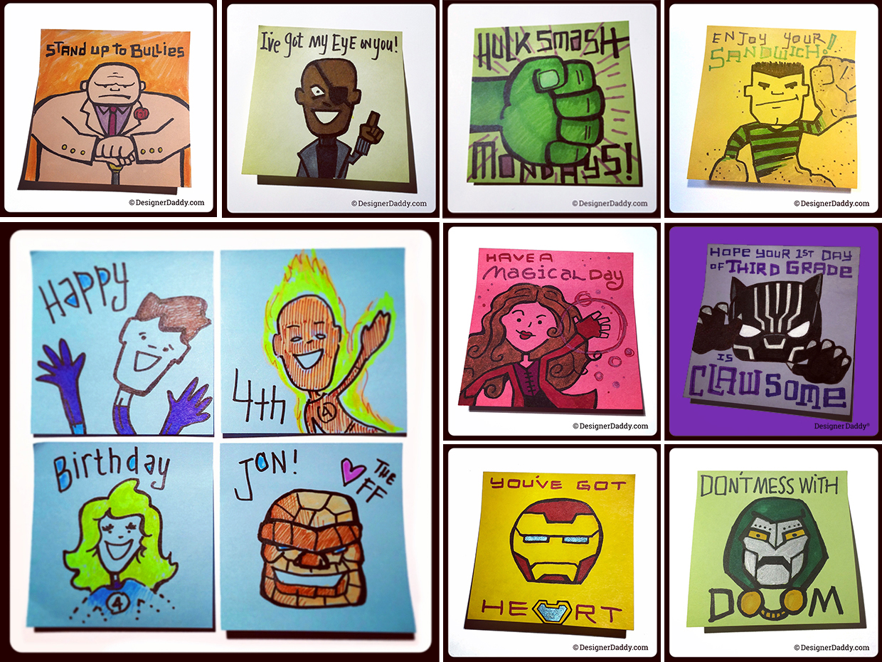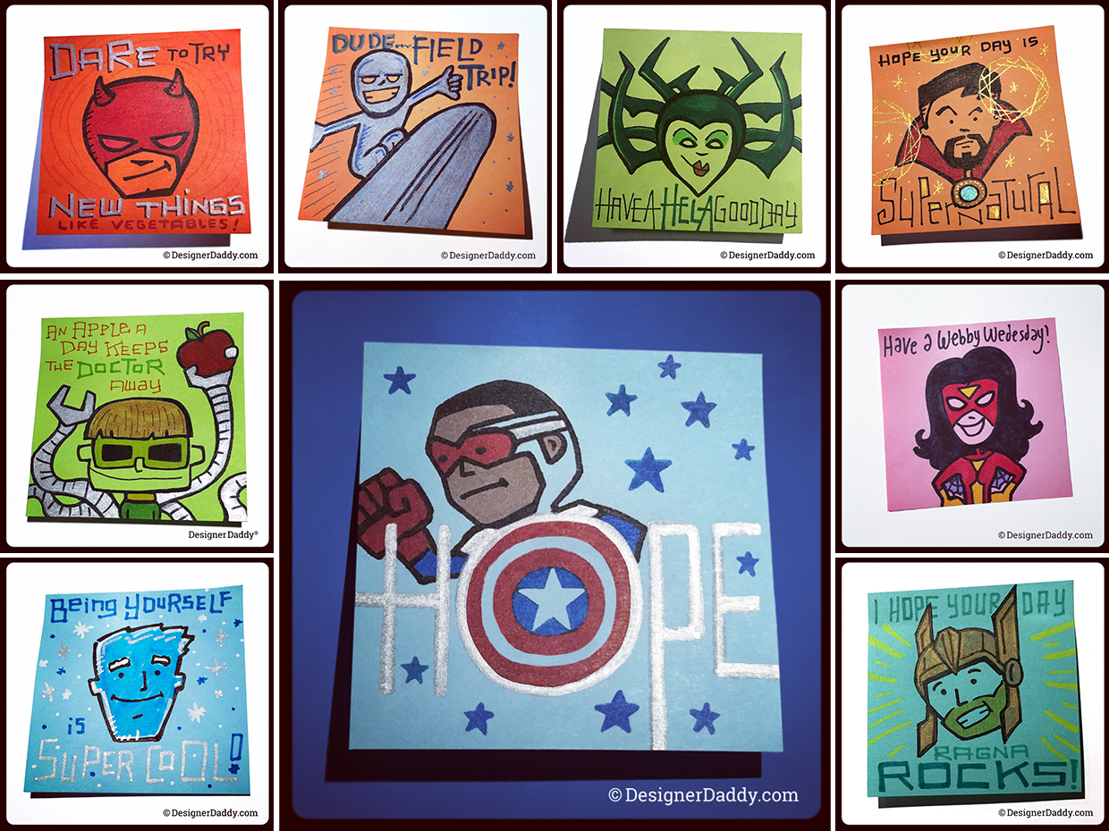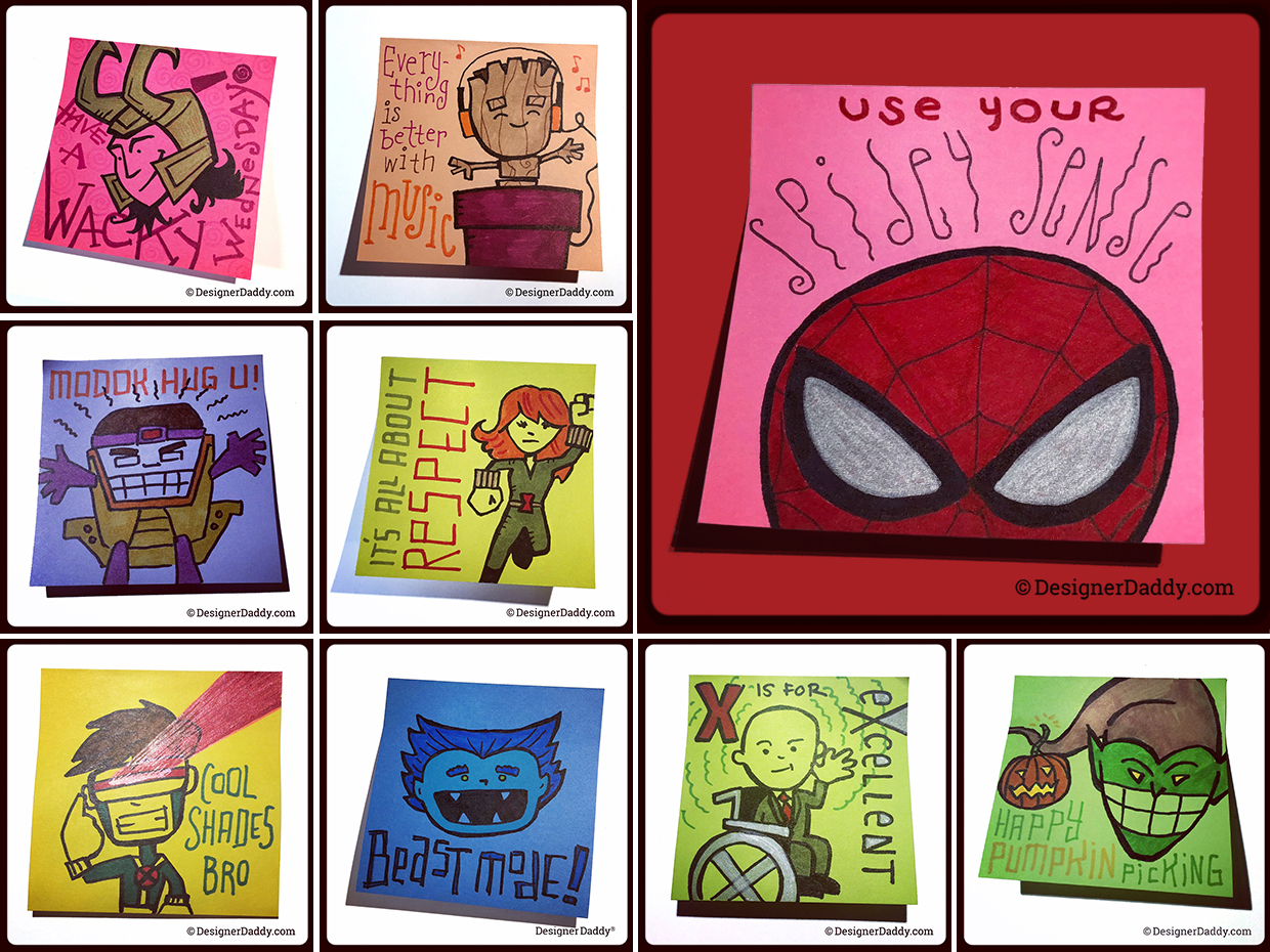Blockbusters and mountains of merch aside, the place that’s fostered the most bonding and my best Marvel education has been in the creation of my son’s lunch notes. Upon a (not very) quick review, 43 characters created by Stan Lee have made an appearance in my son’s lunchbox. Many of them multiple times. My anal retentive/OCD side would love to show them all to you, but the sheer numbers would crash my blog… and test the patience of mere mortals. But here are (more than) a few of my and Jon’s favorites from the past four and-a-half years of lunchbox doodles: