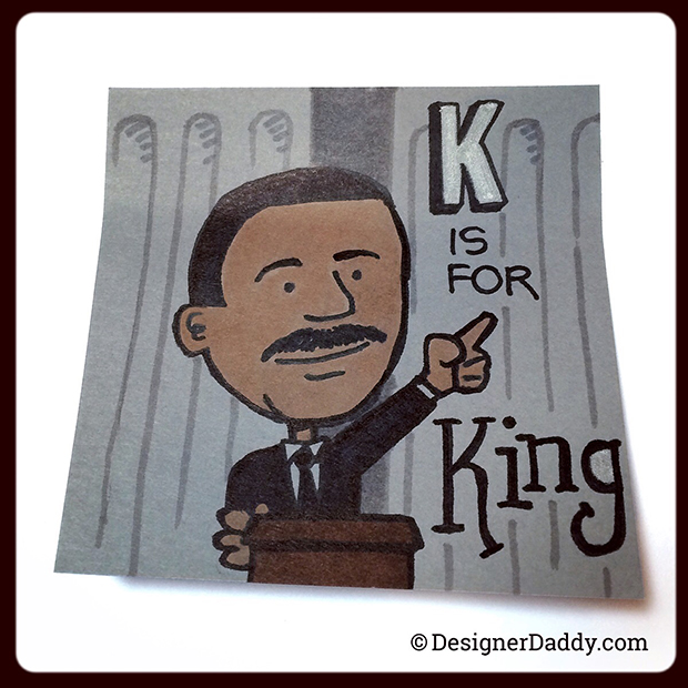 The other wonderful coincidence was getting to the letter “K” on Martin Luther King, Jr. Day, celebrating a real life hero. As I wrote with the Instagram post that day, “It’s kind of amazing to have conversations about MLK with my 6yo. ‘He was a man who changed the laws. Because before, brown people had to be at different restaurants & water fountains. AND THAT’S JUST NOT FAIR!’ Now if I can just get him to stop calling him ‘King Luther.'”