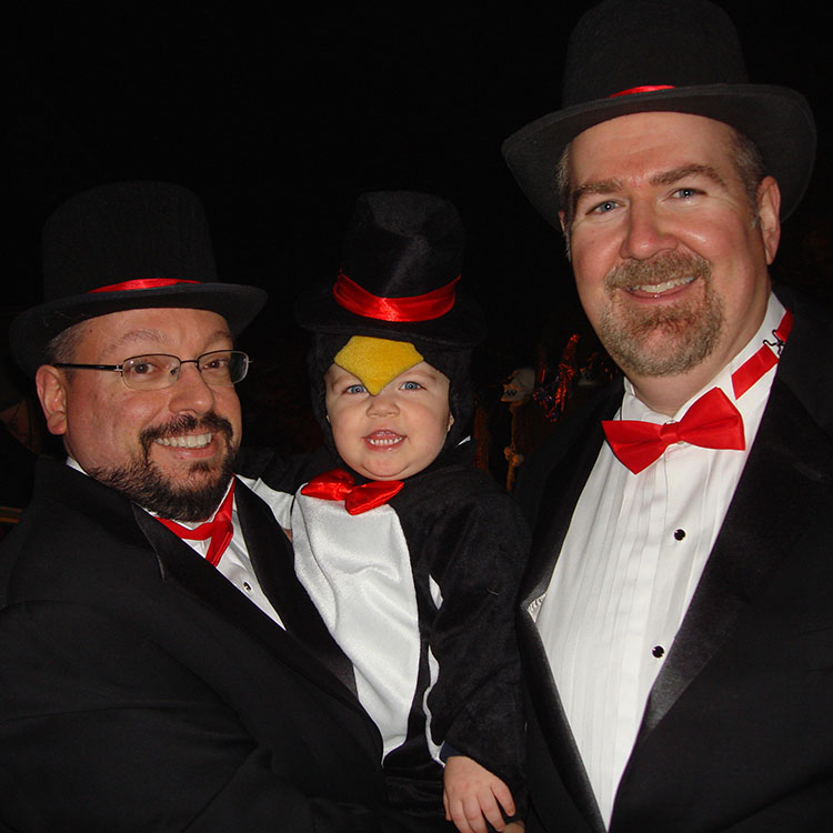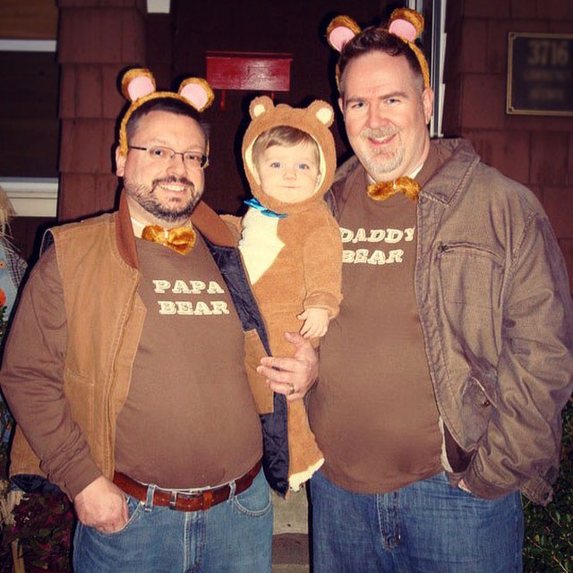 For Jon’s second Halloween, we did a family costume as Roy, Silo and Tango from And Tango Makes Three. This sweet picture book tells the true story of a pair of male penguins who raise an unwanted chick named Tango. It’s a staple in every gay dad’s library and made for some awwww-inspiring trick-or-treating.