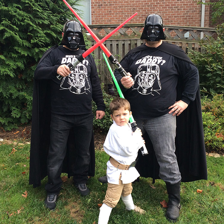 I grew up a huge Star Wars fan, and in 2015 was over-the-moon excited to introduce our kid to a brand new generation of films. Leading up to the release of The Force Awakens, we dressed up as the galaxy’s most infamous father-son pair. Papa and I of course added our own two-dad flair with some “Who’s Your Daddy?” tees that made us (and our energetic Luke) a big hit on the trick-or-treating trail.