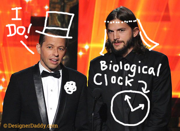 It was reported yesterday that network TV’s longest-running sitcom, Two and a Half Men, will work a “gay” marriage and adoption story into it’s final season. Why the big “gay” quote marks? According to CBS entertainment chairman Nina Tassler, Ashton Kutcher’s character Walden experiences a health scare that causes him to reexamine his playboy lifestyle. This results in him wanting to adopt a child. So far, not so bad.